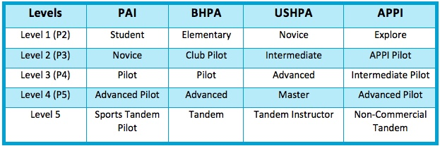 STUDENT, NOVICE, PILOT, Advanced Pilot and Sports Tandem